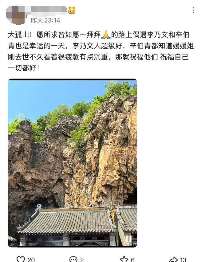 李乃文走在最前头,后面跟着辛柏青和其他几个朋友。辛柏青身边挽着个高挑的小姑娘,眉眼间跟朱媛媛有几分像,那是他俩17岁的女儿本本。小姑娘扎着丸子头,穿得挺休闲,一看就心疼爸爸,一直紧紧挽着他的胳膊,那画面看着又暖又让人难受。 大孤山有棵据说许愿很灵的银杏树,辛柏青就跟着朋友们围着树许愿。镜头里他眼神空落落的,满是悲伤,谁都能看出来他是在给朱媛媛祈福,不少人都在心里祝他能如愿。